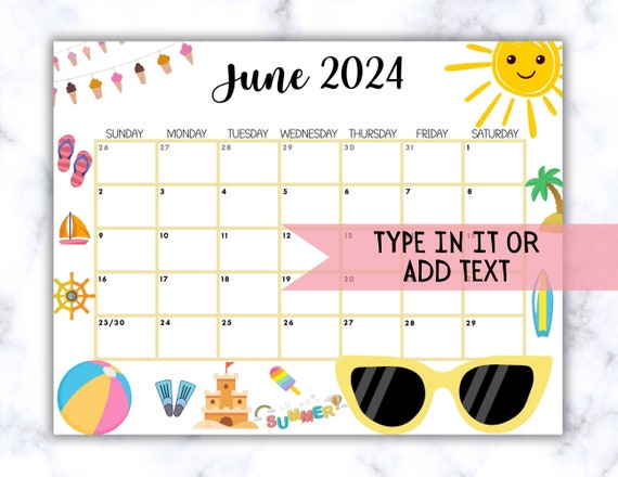 EDITABLE June 2024 Calendar, Printable Wall Calendar 2024, Cute